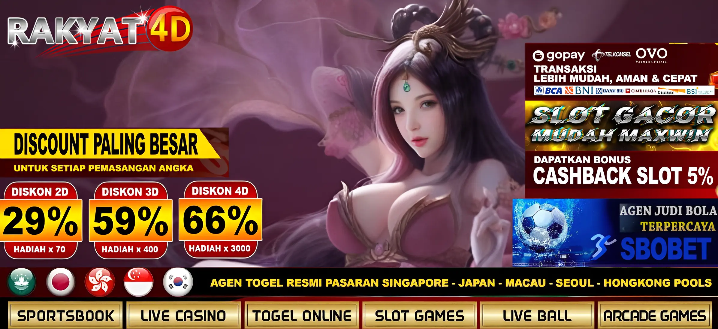 Hanya dalam situs rakyat4d semua bettor bisa menikmati permainan seru yang bisa memberikan keuntungan bettor untuk mendapatkan hadiah jackpot terbesar yang disediakan oleh situs rakyat4d. Karena permainan yang sedang viral untuk saat ini dinyatakan oleh para master penjudi, mampu memberikan jackpot tercepat. Seperti permainan togel online, slot online, live casino, sbobet dan poker online. Semua permainan itu tersedia hanya di rakyat4d saja. Maka itu situs rakyat4d juga membuat transaksi bettor semakin mudah, hanya menggunakan bank, pulsa dan e wallet apa saja akan diterima oleh pihak bandar. Maka dengan begitu semua bettor dapat menikmati permainan dengan mudah aman dan cepat sekarang.